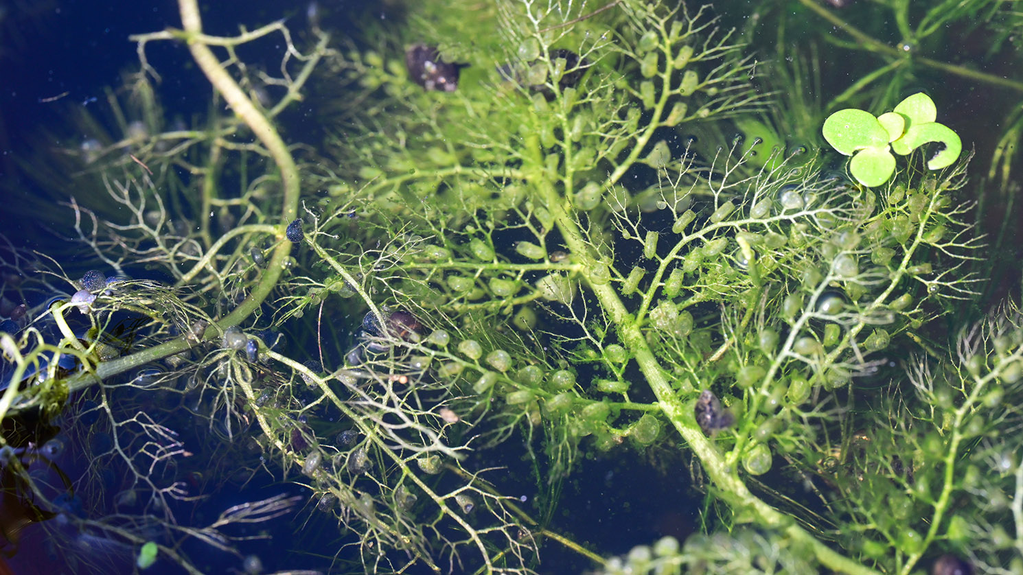 가장 독특한 특징은 '포충낭'이라 불리는 벌레잡이 주머니입니다. 이 작은 주머니들은 처음에는 초록색이지만 벌레를 잡아먹고 나면 검은색으로 변합니다. 물속의 장구벌레나 물벼룩 같은 미생물을 잡아먹고 살아가지요.